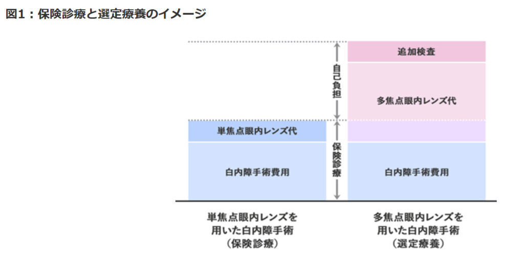 通常の単焦点眼内レンズによる白内障手術費用は保険給付の対象ですが、多焦点眼内レンズ費用については自費でのご負担になります。(選定療養)
